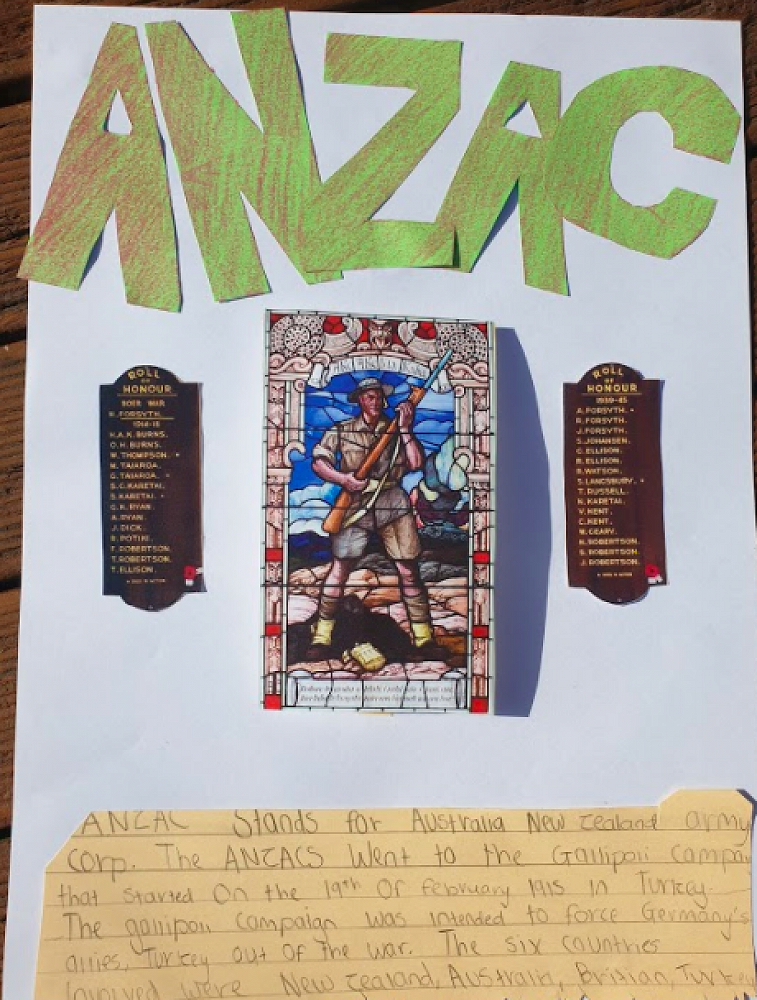 Some of the tasks required art skills, students were asked to make posters, draw WW1 weapons, write poems, play a game that the soldiers would play as they waited in the trenches called "Come in Spinner!" The objective was to have 2 coins on a stick / ruler / piece of wood and to guess what "face" would be up when the toss was finished. As you can see Evie (Mekalo's dog) was keen to get into the action too! I added some art (not related to ANZAC) from Will Summers also. Students represented in this article are; Gemma, Will, Archie, Mekalo, Nick, Taiaroa, Taylor and Ezra.